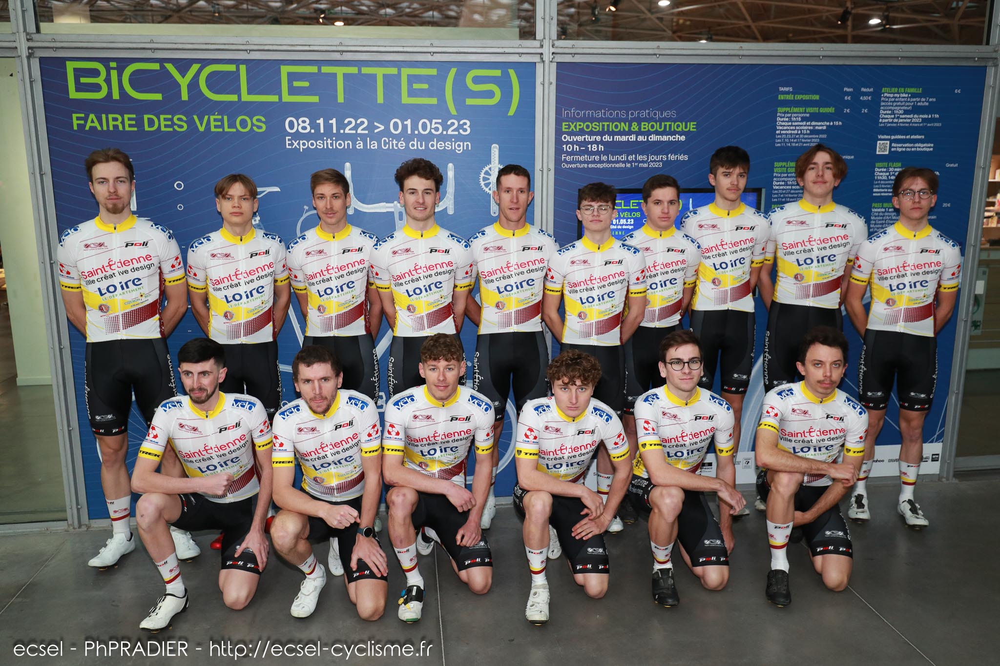 C’est le cadre somptueux de la Cité du Design de Saint-Etienne que nos coureurs élites et juniors avaient rendez-vous pour la traditionnelle séance de photos officielles. Ce shooting, formelle mais conviviale, avait pour écrin les 70 vélos de l’exposition [Bicyclette(s), faire des vélos],